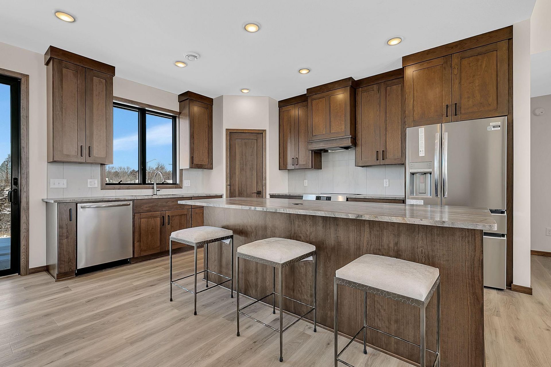 Enjoy easy one-level living in this bright and airy custom-built home featuring 3 bedrooms and 2 bathrooms, thoughtfully designed for everyday living and entertaining. The great room boasts over 10 ft high ceilings, large transom windows that fill the space with natural light, and a modern electric fireplace, and is open to the spacious dining area and a beautifully appointed kitchen with soft-close cherry cabinetry, natural quartzite countertops, and a walk-in pantry. The privately situated owner's suite offers a tray ceiling, generous walk-in closet, and a luxurious bath with dual quartz topped vanities and a walk-in tile shower. Two additional bedrooms and a full bath with a granite vanity and stylish 2x4 porcelain tile surround are located on the opposite side of the home. A functional entry area includes ample storage and a built-in planning desk with granite tops. Additional highlights include custom cherry millwork, LVP flooring throughout, custom closet organizers, in-floor heat along with high-efficiency forced air natural gas heating and central air, and an insulated 3-stall garage. Built with quality in mind, the home features steel siding and Andersen windows, and comes from a builder recognized for energy efficiency over the past four years. Situated on a 0.79-acre lot with a scenic creek and wetland backdrop, the property also benefits from association-provided lawn care and snow removal, plus access to the Deer Creek pool.